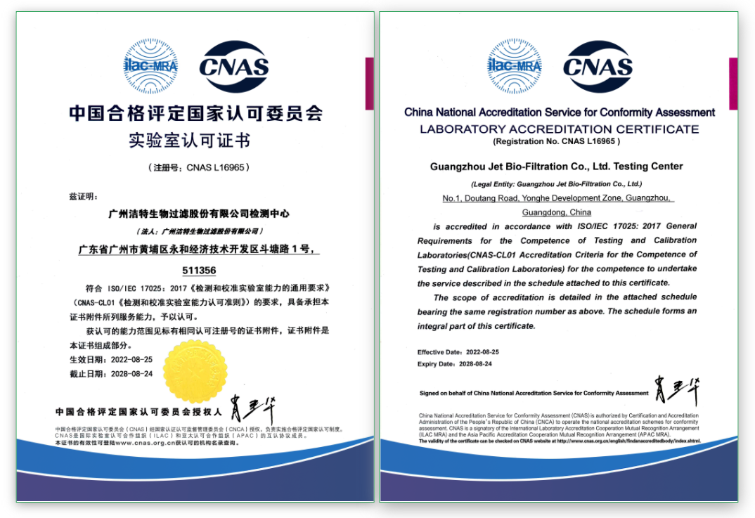 近日,中國(guó)合格評(píng)定國(guó)家認(rèn)可委員會(huì)(CNAS)向廣州潔特生物過(guò)濾股份有限公司(以下簡(jiǎn)稱“潔特生物”)的檢測(cè)中心頒發(fā)了實(shí)驗(yàn)室認(rèn)可證書(shū),證書(shū)編號(hào):CNAS L16965。