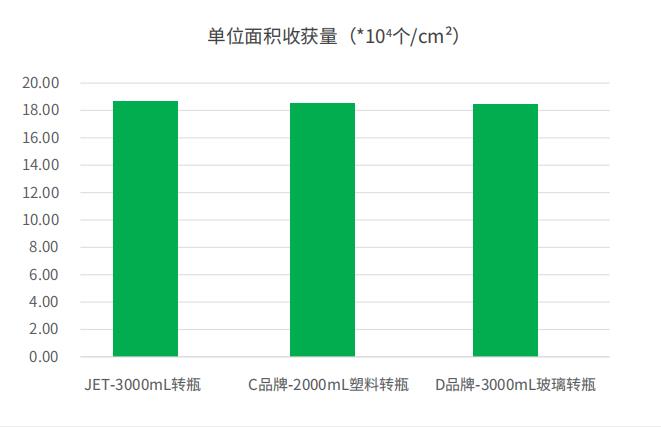 將 Vero細(xì)胞以2.59 x 104個(gè)/cm²的密度分別接種至潔特生物3000mL細(xì)胞培養(yǎng)轉(zhuǎn)瓶、國(guó)際知名D品牌、國(guó)際知名C品牌轉(zhuǎn)瓶中,并使用10rph的轉(zhuǎn)速培養(yǎng)120小時(shí),分別統(tǒng)計(jì)單位面積細(xì)胞收獲量及增殖倍數(shù)。