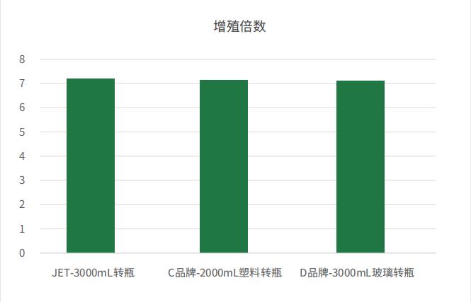 結(jié)果表明:在潔特生物3000mL細(xì)胞培養(yǎng)轉(zhuǎn)瓶中培養(yǎng)的Vero細(xì)胞單位面積收獲量和增殖倍數(shù)與國(guó)際知名品牌相當(dāng)。