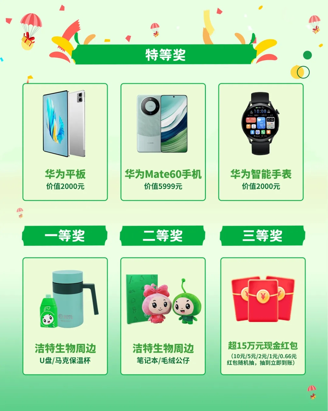 購買潔特生物細(xì)胞培養(yǎng)板、細(xì)胞培養(yǎng)瓶,開箱就能掃碼抽獎!每箱活動產(chǎn)品含有1~4個抽獎二維碼,如果您購買了一箱活動產(chǎn)品,您將獲得最多4次抽獎機會哦!中獎率高達(dá)90%以上!可以瓜分15萬元紅包池,更有華為Mate60手機/平板/手表、潔特生物周邊等你抱回家!