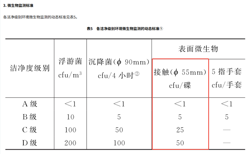 在食品、藥品生產(chǎn)過程以及GMP標準實驗室中,環(huán)境的潔凈度監(jiān)控至關重要,而環(huán)境中的表面微生物水平是評估環(huán)境潔凈度等級的重要指標,《中國藥典》(2020)微生物監(jiān)測指導原則中指出,接觸碟法是對規(guī)則表面或平面微生物監(jiān)測的常用方法,每碟取樣面積約為25cm²(Φ55mm),微生物計數(shù)結(jié)果以cfu/碟報告,根據(jù)其檢測結(jié)果可評估環(huán)境潔凈度等級。