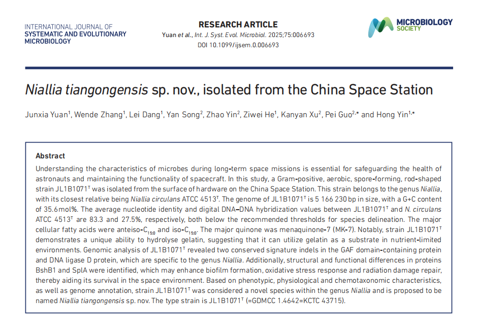 近日,中國(guó)科研團(tuán)隊(duì)首次公布在空間站內(nèi)發(fā)現(xiàn)的全新微生物物種——“天宮尼爾菌”(Niallia tiangongensis),這一成果發(fā)表于國(guó)際權(quán)威期刊《International Journal of Systematic and Evolutionary Microbiology》,引發(fā)全球關(guān)注。