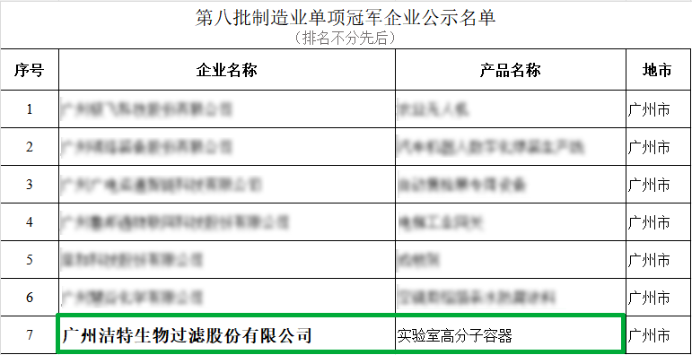 近日,廣東省工業(yè)和信息化廳發(fā)布了《第八批全國制造業(yè)單項冠軍企業(yè)》名單,廣州潔特生物過濾股份有限公司憑借生物實驗室耗材關鍵核心技術和先進生產(chǎn)工藝創(chuàng)新研發(fā)能力以及遙遙領先的市場占有率榮獲制造業(yè)單項冠軍