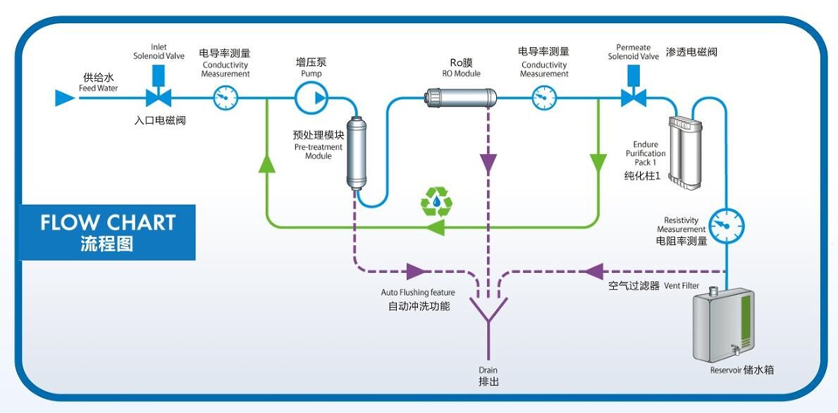 在RO純化過程中,不符合要求的水并未流入下一個純化環(huán)節(jié),而是重新回流至RO步驟中繼續(xù)反滲透,只有達(dá)到標(biāo)準(zhǔn)的水才能進(jìn)入DI環(huán)節(jié)進(jìn)行去離子純化。因此,DI耗材包只接觸到了純凈的RO水,一定程度上增加了其使用壽命。